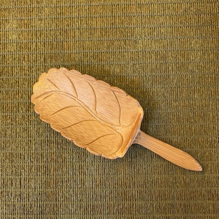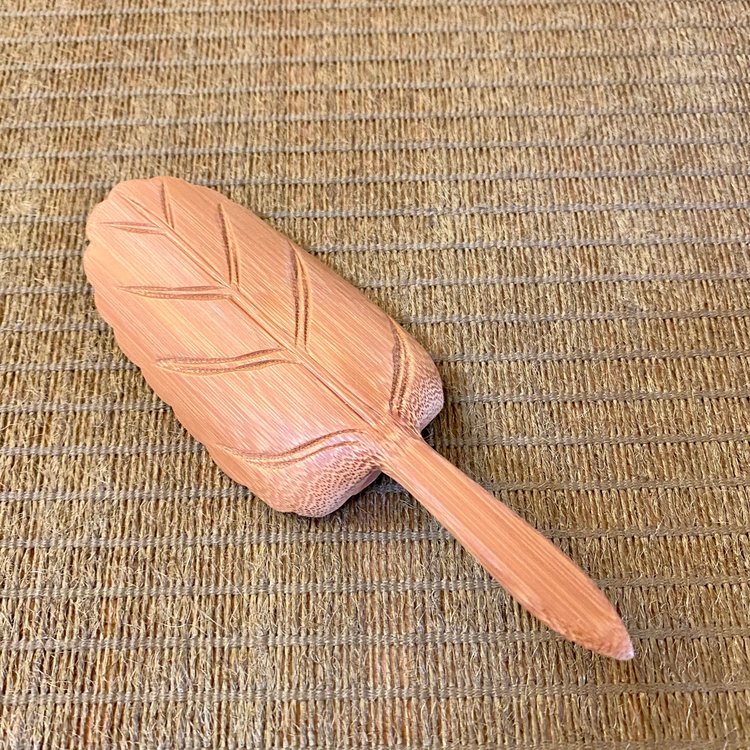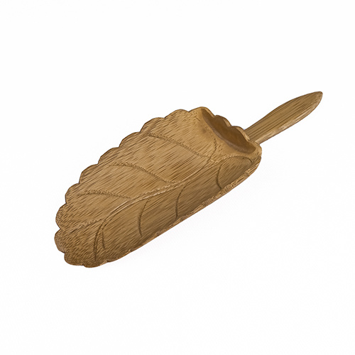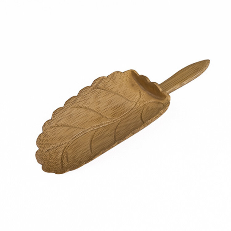• This bamboo tea scoop is handcrafted from Taiwanese bamboo, with its beautiful leaf shape. It can be used to transfer tea into a teapot or gaiwan, allowing appreciation of the dry leaf before the brewing process begins. Measures 1.75” x 5”