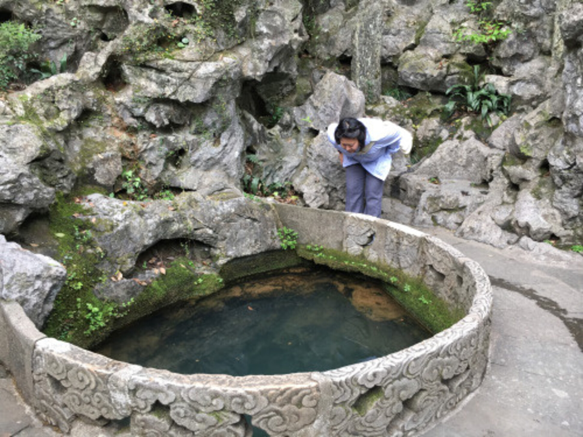 Ah, Pre-Ming Dragonwell, one of the most well-known Chinese green teas. How did Dragonwell (Longjing 龍井) from Hangzhou become one of these most sought-out teas? The name “Dragonwell” refers to an ancient well at the base of the mountain in the village of Longjing, one of the many villages within the West Lake (Xi Hu西湖) region of China where this tea is grown. When rainwater fell upon the higher density groundwater in the well, the waters would interact to create an undulating, whirling movement that resembled dragons. Pictured above is Teance founder Winnie Yu peering into the original "dragon well."