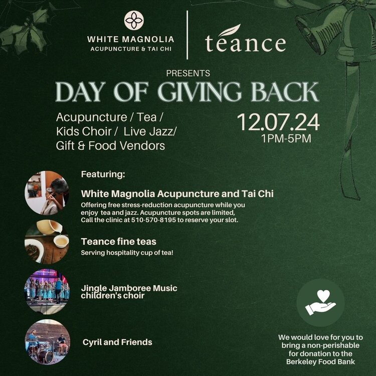 • Sat. @1-5pm : Teance Fine Teas and White Magnolia Acupuncture and Tai Chi present our 3rd "Day of Giving Back Event". Hospitality teas, stress-reduction acupuncture, holiday choir, Tai Chi Demonstration & live jazz!