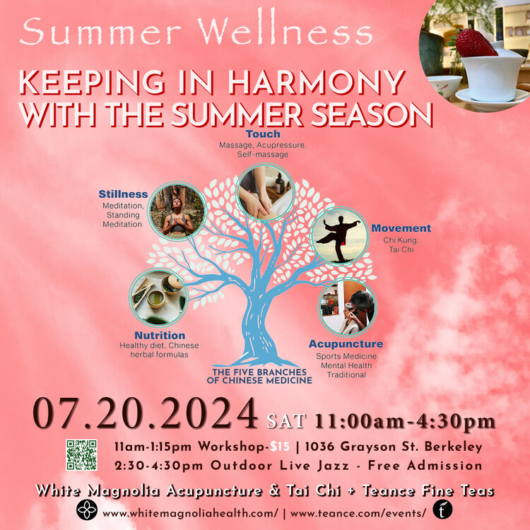 11:00am-12:30pm Keeping in Harmony with the Summer Season: Presenters - John Luna-Sparks LAc. of White Magnolia Acupuncture & Tai Chi + Katie Tao of Teance.