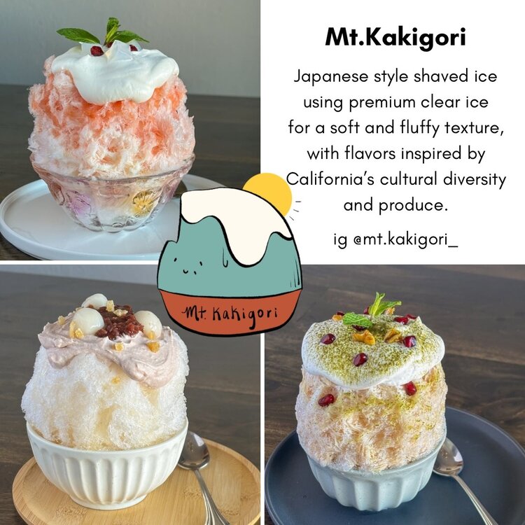 01:15 - 4:30: Mt.Kakigori pop-up ~ Japanese style shaved ice using premium clear ice for a soft and fluffy texture, with flavors inspired by California’s diverse culture and produce. Flavors at the event will be Spring themed! IG: @mtkakigori FB: @mt.kakigori_