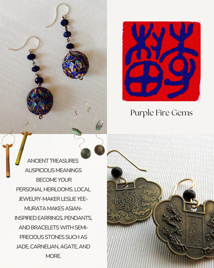 **Purple Fire Gems: Ancient treasures & Auspicious meanings become Your Personal Heirlooms.Local jewelry-maker Leslie Yee-Murata makes Asian-inspired earrings, pendants, and bracelets with semi-precious stones such as jade, carnelian, agate, and more.