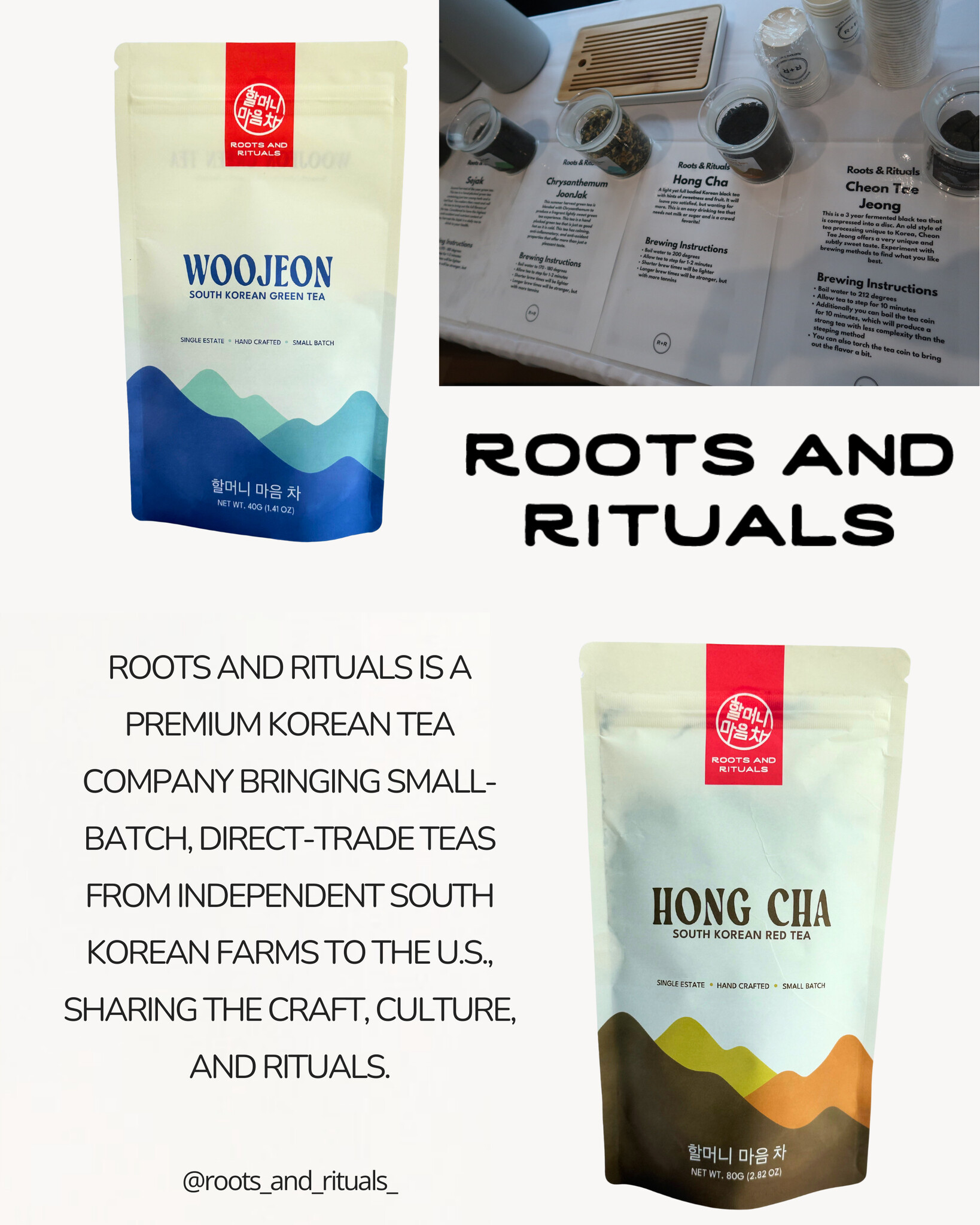 **Roots and Rituals Halmoni San Korean Tea: We promote wellness through single origin, hand picked teas, from South Korea. Halmoni San means grandmother mountain and is an ode to the predominantly 60-70 year old women who hand pick tea in the mountains of Boeseong South Korea where this tea is grown.