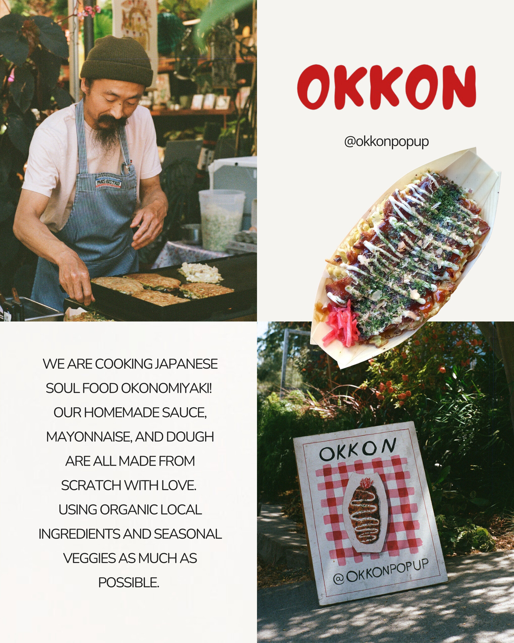 **Okkon: We are cooking Japanese soul food Okonomiyaki! Our homemade sauce, mayonnaise and dough are all made from scratch with love. Using organic local ingredients and seasonal veggies as much as possible.