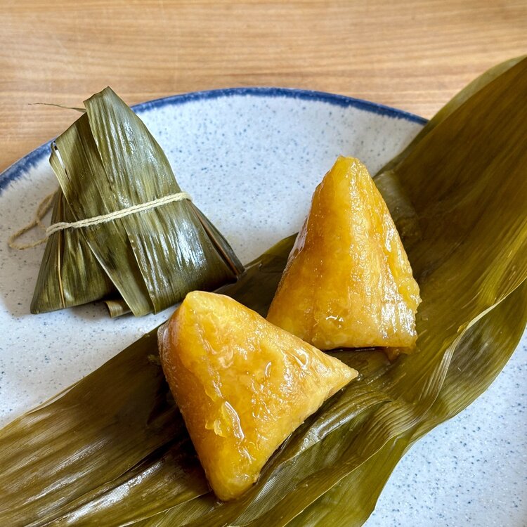 Instead of the more typical savory zong with meat and peanut fillings, Jian Zong is made with alkalized glutinous rice, which makes the rice translucent, bouncy, and chewy, and is typically eaten with sugar or syrup. It is a traditional food eaten for Dragon Boat Festival (5/31 on Gregorian calendar this year) in the Chinese culture!
