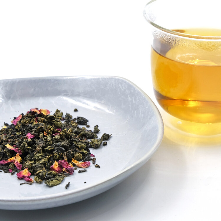 Rose petals are mixed in to complement the oolong tea with a delicate aroma and floral flavor. Rose buds and petals are considered warming and sweet in traditional Chinese herbal medicine and help to gently, yet effectively promote the movement of stagnant qi and harmonize blood. Rose petals can also help open the chest when there are feelings of constraint, and they help harmonize the Liver, Spleen, and Stomach.